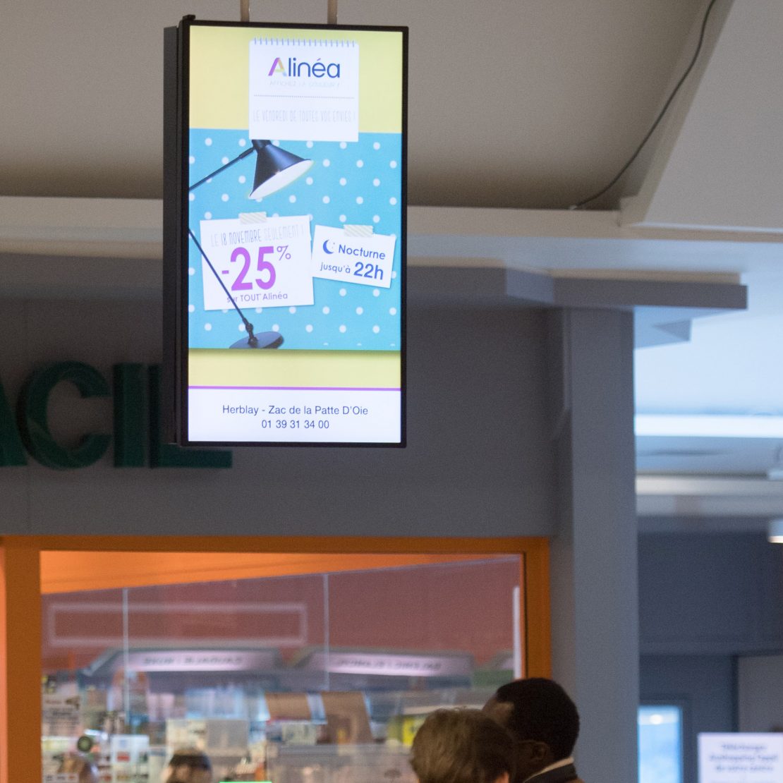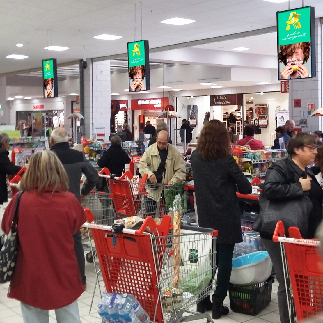 In store : écrans suspendus en arrière de caisses (GSA).